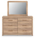 The natural wood tones and clean lines of this dresser echo your easygoing style sensibilities. With a warm finish and replicated oak grain, its carefree character lightens up your bedroom. Curved inner corner details soften the look, while sleek bronze-tone hardware modernizes the feel.