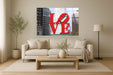Capture the essence of urban romance with this striking photograph of a famous city sculpture. The bold red letters stand out against the backdrop of towering buildings, creating a dynamic and modern aesthetic. Perfect for adding a touch of love and vibrancy to any contemporary space.