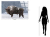 Experience the serene beauty of winter with this stunning photograph of a bison standing proudly amidst a gentle snowfall. The image captures the majestic presence of the bison, its coat dusted with snowflakes, set against a tranquil winter landscape. Perfect for adding a touch of nature's elegance to your living space.