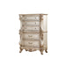 The Gorsedd chest is exclusively designed and filled with romantic spirit. Expertly detailed, the chest is crafted with romantic elements combining Queen Anne legs and ornate floral accents in matching golden ivory finish. Add glamorous French provincial charm with this uniquely designed collection that will make a statement in any bedroom