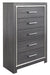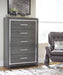Reminiscent of Hollywood glamour of yesteryear, this chest of drawers interprets luxury in a decidedly modern way. A dazzling gray finish and faceted chrome-tone accents enhance the star power. Five smooth-gliding drawers provide enough storage to appease your inner diva.