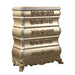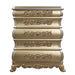 Intricately hollow carved design with romantic scrolling accent highlights this extraordinary style. The Seville Bedroom Collection creates opulence and drama in your room with the dazzling gold hue that enhances its detailed extravagance. Button tufted headboard and footboard add depth and a luxurious sense of comfort. Matching casegoods offer self-closing drawers with built-in safety stops and felt-lining. Show your confidence and make a bold statement in your personal space with the Seville Bedroom Collection.