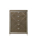 The Skylar chest immerses you in enduring glam and sophistication. Delight yourself in the features this stunning chest offers. The finish is glamorous, adding to that glamour is the beveled mirrored trim on the edges, this helps reflect light and make the piece stand out. This chest features five ample drawers including felt-lined top drawers, and side metal glides, and are reinforced by English dovetailed joints. The drawer fronts feature an embossed geometric pattern for added visual appeal. Finished off with geometric-style metal pull knobs, and stylish acrylic tapered legs.