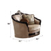 The Ernestine sofa set is an impeccable example of truly remarkable and opulent traditional design. From the curved wood trim on backrest and armrest to the wooden bun leg, every detail boasts old world elegance. Covering in tan fabric, it features tight back and loose seat cushion with pocket coil seating system. Accent pillows are included to add style and comfort to your living room. With matching occasional tables, this collection will certainly be an extraordinary addition to any living room.