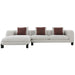 The Mardi sectional sofa adorned in a chic beige and maroon boucle, exudes modern sophistication and comfort. Accompanied by plush pillows, this sectional is perfect for relaxing or entertaining. Its unique fabric and color combination bring a touch of elegance and warmth to any living space, making it a stylish focal point for your home.