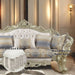 Exclusively designed and filled with romantic spirit, this beautiful sofa features Queen Anne legs and carved aprons and trims, decorated with raised and scrolled floral motifs in a golden ivory finish. Each piece of this sophisticated living room set boasts of curved and rolled arms, oversized molding and crystal-like button tufted backrests with nailhead trim. This three piece collection with contrasting accent pillows will bring sophistication to your living room and will add elegance to any room Decor.