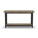 Showcase your family photos or display your cherished collectibles with the Carpenter sofa table. Versatile enough to stand on its own in an entryway or as a companion to a sofa or sectional, this table features a planked wood top and an open lower shelf to offer ample display area. Hand-worked metal frames and exposed bolt heads provide an industrial vibe, while distressed acacia planks give a reclaimed, rustic look. This table's dark brown rustic style is sure to elevate your living space.
