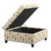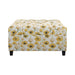 - The Celia storage ottoman livens up any room with the burst of color from the printed poppy pattern storage ottoman and accent pillows that contrasts well with the bronze nailhead trim, elegant rolled arms, and tapered solid wood legs.