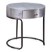 Assembled, Drum End Table Storage: 1 Drawer () Patchwork Aluminum Top/Drawer Metal Round Frame (Open) CONSTRUCTION Patchwork Aluminum Top/Drawer: Aluminum, Frame: Ply Metal Frame Base: Iron (Size 16"H)