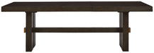 Dressed to thrill, this simply stunning dining table offers a high-design look at a down-to-earth price. Ultra sleek lines are accentuated with a dark waxy brown oak-tone finish that’s so easy on the eyes. Clean-lined and modern, the double pedestal base and thick edge tabletop showcase quality craftsmanship and attention to detail. Whether you're hosting family meals or holiday entertaining, it has a timeless look that’s made to last.