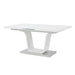 This Kamaile dining table is modern and stylish, and the smooth white high gloss is inviting in any dining space. The extending dining table features a beautiful chrome base with an open U-shaped pedestal and is complimented by a wooden top. The tabletop can be easily expanded to accommodate additional dining guests.
