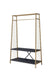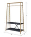 Inspired by contemporary line art, the hall tree showcases a open frame with clean lines that enhances the fashion sense of the space. A gold finish beautifully complements the metal frame while it's shelves in a deep black finish highlight your collections. There are two tier shelves and a hanging rail that allow your to showcase your personal'style.
