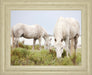 Step into a tranquil countryside scene with this captivating image of two white horses peacefully grazing in a lush green meadow. The soft, muted palette of whites, greens, and beiges creates a calming atmosphere that invites relaxation and reflection. Encased in an elegant ivory bliss frame with premium real glass, this framed photographic print brings a touch of nature's serenity into any living room, bedroom, or office. Its horizontal orientation and contemporary style make it a versatile piece that complements modern interiors while evoking a timeless sense of peace and quiet beauty.