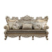 • Oversized Scrolled Carving Trim with Nailhead Trim: Detailed Accents Inside/Outside Backrest: Champagne Finish, Poplar Wood (Front Armrest, Leg & Base)