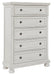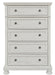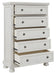 Elegant, timeless furnishings take your bedroom to the next level. Nothing does that better than this chest. The antiqued white finish with a wonderful grain texture radiates sophistication, while the dark bronze-tone hardware adds an ornate touch. A felt-lined top drawer rounds out the piece for the ultimate tasteful bedroom.