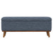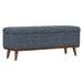 For a cool blend of modern style and practical function, look to the Rory storage ottoman. With its dark walnut-toned solid wood exposed frame and tapered legs, this piece brings a solid beat to any room. The tufted top, upholstered in dark blue fabric with flecks of gray, adds just the right touch of sophistication. Hidden storage keeps your essentials under wraps, while its classic nod to midcentury designs add just the right tune to your living room, entryway, or bedroom.
