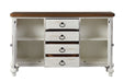 The elegant Vernon Console Table features an antique white finish with decorative cabinet door inlays. The rectangular wood console table features 4 center drawers and 2 doors on each end that reveal 4 additional shelves, providing ample display and additional storage space. The modern style cabinet in antique white with decorative cabinet doors and bun legs will add a stylish accent to every room in your home. Whichever room you choose to use the Vernon in its style will not only blend masterfully but is sure to be the conversation piece.